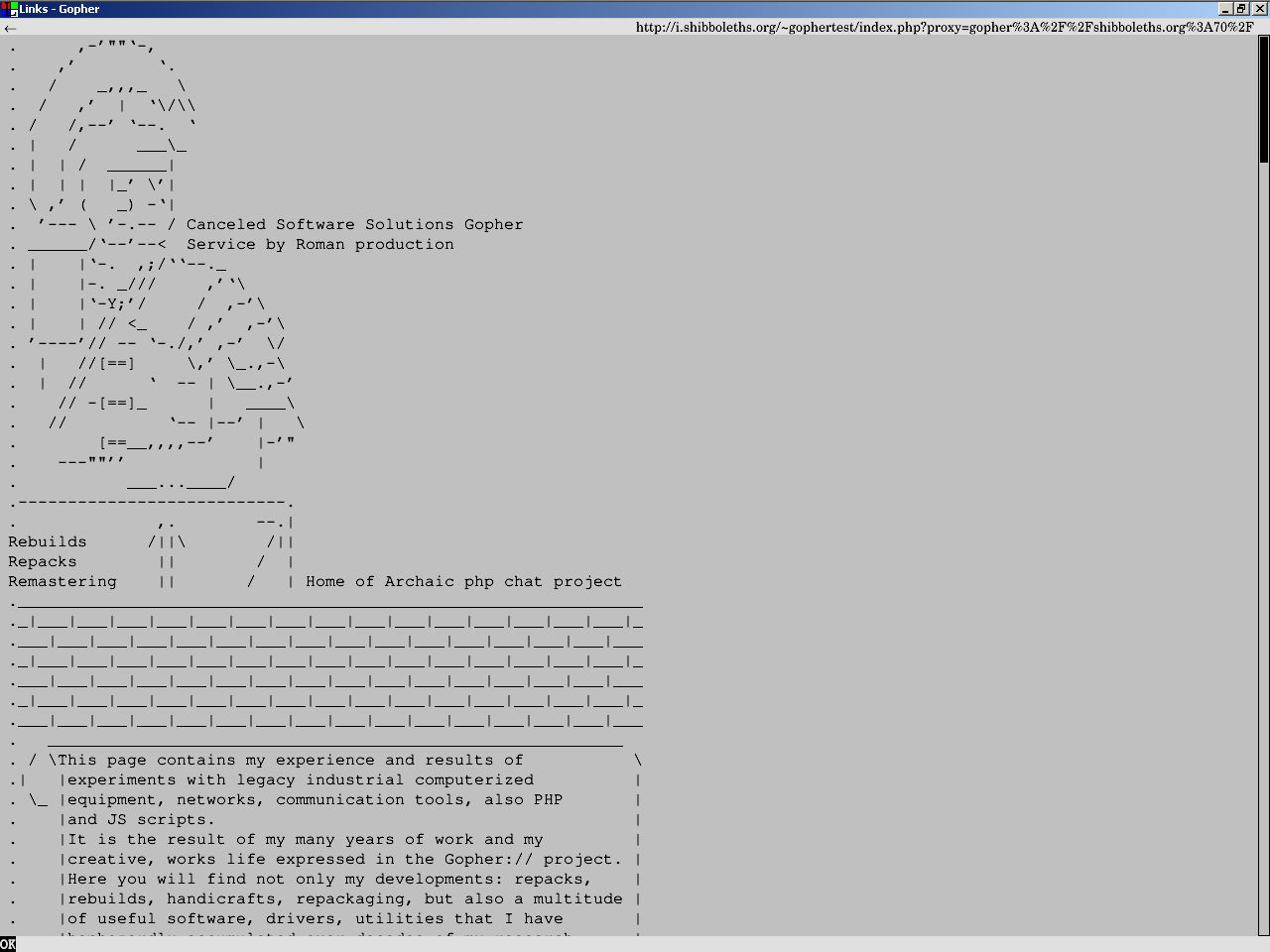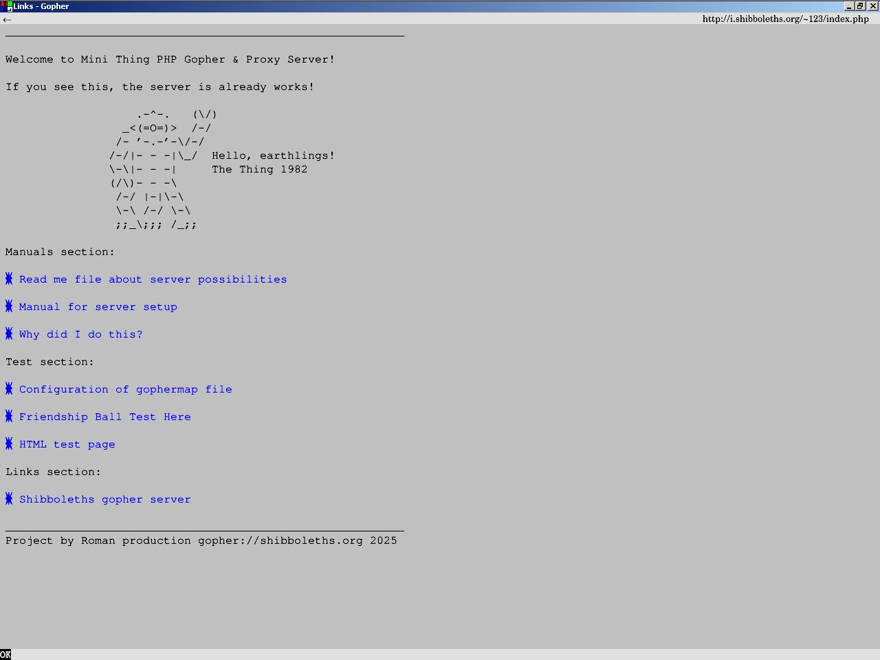 Modern Gopher:// projects contain a lot of unique content, have a lot of scripts and are available from many different platforms. Here is just a small list of Gopher browsers that you can download from my Gopher:// page. For Windows XP - 11 you can use my modern 2024 browser Kmeleon Gopher Browser. For Windows 9x/NT/2000/XP just use other my browsers builds Seamonkey 1.1.19 or Kmeleon 1.5.4 with SSL/TLS 1.3 support! Also you can use for all Windows NT series native Gopher browsers: Gopherus, Little Gopher or WsGopher 1.2, Blue Skies 1.0b for Windows 3x. However, remember that native gopher browsers cannot view HTML documents! Also worth mentioning are Gopher text browsers for DOS/Windows 9x: Lynx for DOS and Lynx for Win32. You can even use Netscape or Internet Explorer to view Gopher up to version 6.0. But the quality of this viewing will be questionable. For PHP8+ you can use my Mini Thing PHP Gopher & Proxy Server for any browser!